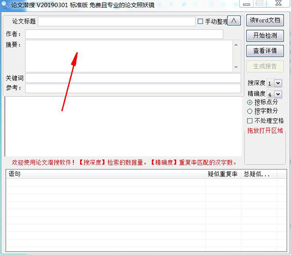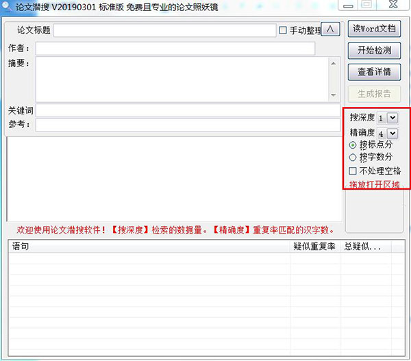 2、設(shè)置論文搜深度和精確度,點擊開始檢測即可。查看詳情可查看重復(fù)報告。