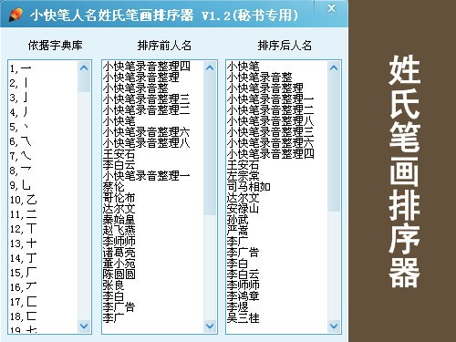 小快筆人名姓氏筆劃排序器是一款非常好用的人名筆畫排序工具,這款工具依據(jù)權(quán)威漢字筆畫順序,能夠解決名字書畫排序麻煩的煩惱,一鍵排序,簡簡單單!