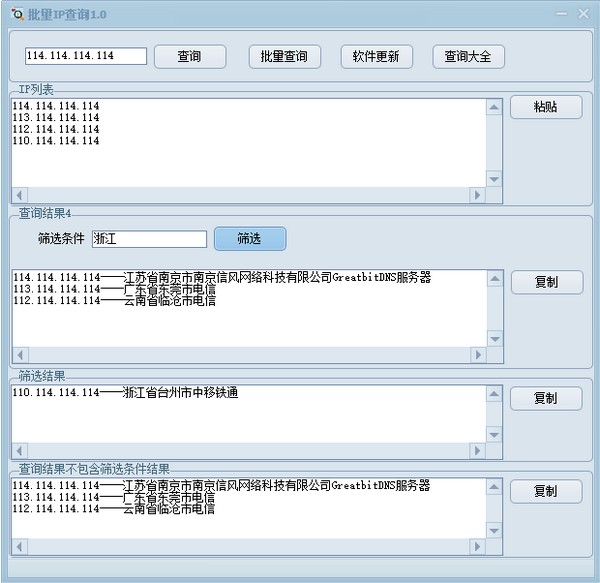 ip地址批量查詢是一款可以幫助用戶快速查詢IP地址的軟件,用戶可以通過導(dǎo)入多個(gè)IP列表進(jìn)行查詢,使用簡單,支持查詢結(jié)果篩選,速度超快,感興趣的用戶不要錯(cuò)過了哦!