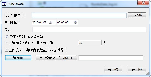 RunAsDate是一款非常強大的用來突破一些軟件時間限制的小工具,使用簡單,支持建立運行在特定日期時間的快捷方式,便于以后使用。通過RunAsDate更改指定軟件的時間,那么我們就可以使用任何具有使用時間限制的軟件。