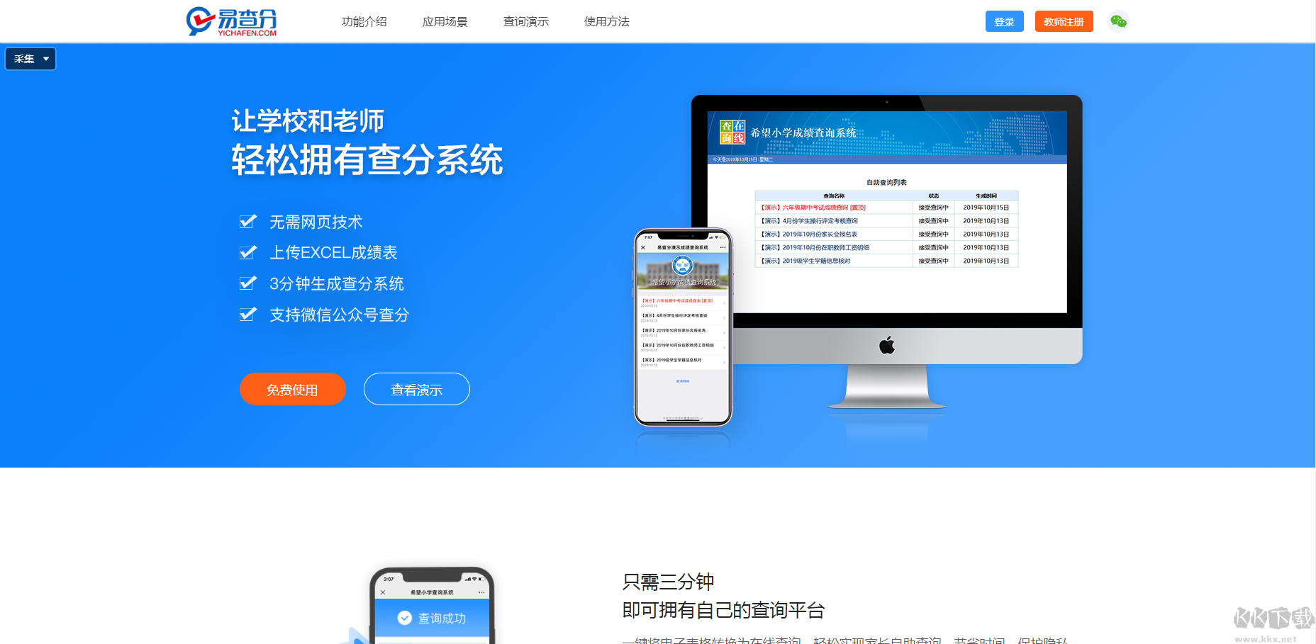 《易查分APP》是一款非常好用的學(xué)生成績(jī)查詢系統(tǒng)軟件。老師只需把學(xué)生成績(jī)表的Excel表格上傳,就會(huì)生成一個(gè)專屬的網(wǎng)上成績(jī)查詢系統(tǒng),生成后會(huì)得到一個(gè)專屬查分網(wǎng)址和而二維碼??商峁┙o學(xué)生或家長(zhǎng)進(jìn)行成績(jī)查詢,方便快捷!有需要的朋友不要錯(cuò)過(guò),KK下載站推薦大家下載體驗(yàn)!