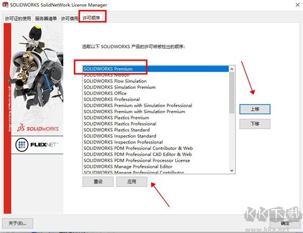 10、運(yùn)行軟件,依次打開幫助> SolidNetWork License Manager >許可順序,將Premium產(chǎn)品移動到Professional和Standard之上,點(diǎn)擊應(yīng)用并確定,重新啟動;