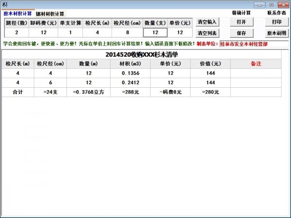 7、單支計算:價格=數(shù)量*單價,不按材積立方計算價格,在單支計算中輸入1或0則按單支計算價值,輸入其他都是按材積立方計算價值,當(dāng)然材積還是計算在總材積內(nèi)的;(如:當(dāng)在單支計算輸入1時,數(shù)量輸入8;單價輸入20;那么回車后下表框價值顯示為160);