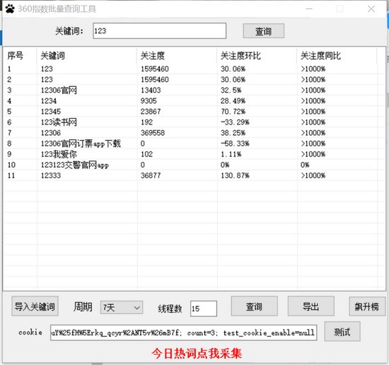360指數(shù)批量查詢工具是KKX小編給大家分享的360趨勢指數(shù)批量查詢軟件,該軟件主要功能是支持下拉詞采集,能夠采集到關(guān)鍵詞、關(guān)注度、關(guān)注度環(huán)比、關(guān)注度同比等數(shù)據(jù)!
