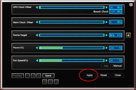 現(xiàn)在玩家們可以開始自由發(fā)揮啦,選擇自己想要的頻率和電壓以及顯卡風(fēng)扇轉(zhuǎn)速,點(diǎn)擊Apply應(yīng)用,如想恢復(fù)默認(rèn)設(shè)置,點(diǎn)擊Reset即可。