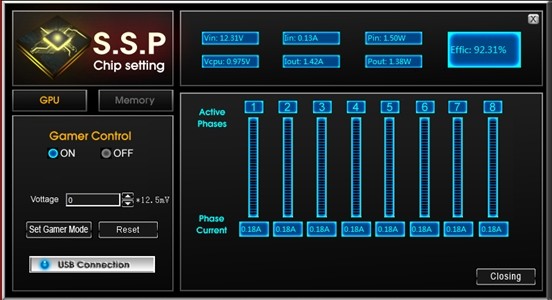 在Gamer Conlrol選擇ON,玩家們可以自行對顯卡的GPU核心和顯存進(jìn)行加電壓,建議一次不可加太多,逐步微調(diào),設(shè)置好電壓后,點(diǎn)擊Set Gamer Mode保存即可,如果想恢復(fù)默認(rèn)設(shè)置,點(diǎn)擊Reset重置。