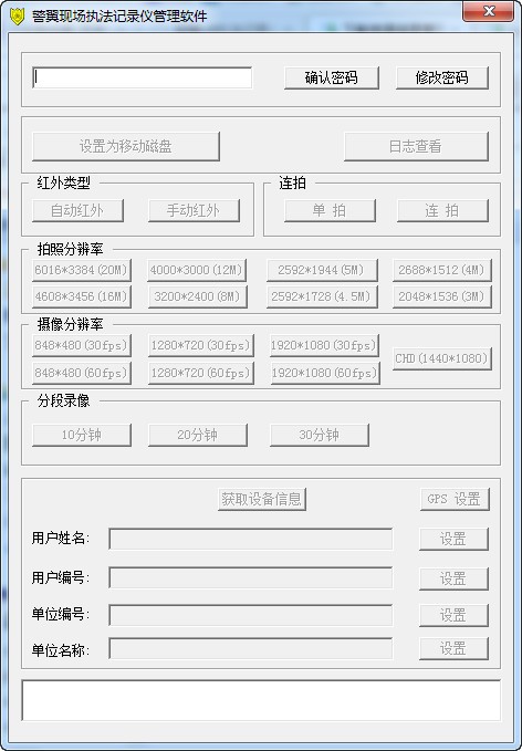 警翼現(xiàn)場(chǎng)執(zhí)法記錄儀管理軟件是一款實(shí)用的執(zhí)法記錄儀管理工具,連接電腦時(shí)需要安裝驅(qū)動(dòng)后再使用該軟件進(jìn)行連接,如果其他軟件無(wú)法識(shí)別,那么就是版本不合符導(dǎo)致的問題了。通過軟件用戶能夠設(shè)置執(zhí)法記錄儀的信息、設(shè)定操作參數(shù)定、導(dǎo)出文件等操作,密碼請(qǐng)查看記錄儀說明書,支持設(shè)置紅外類型及連拍模式,分段錄像時(shí)間間隔以及拍照分辨率和攝像分辨率。