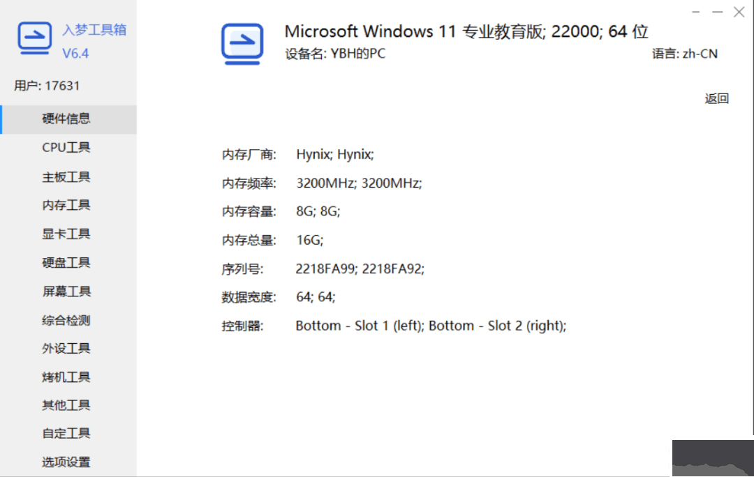 左側是工具分類區(qū),右側為工具區(qū)。第一項顯示的是硬件信息,硬件信息能夠一鍵復制到剪貼板,硬件信息包括內存、主板、顯卡、硬盤等常見硬件的信息數據,點擊具體硬件項目之后,還能進一步顯示該硬件的詳細信息。