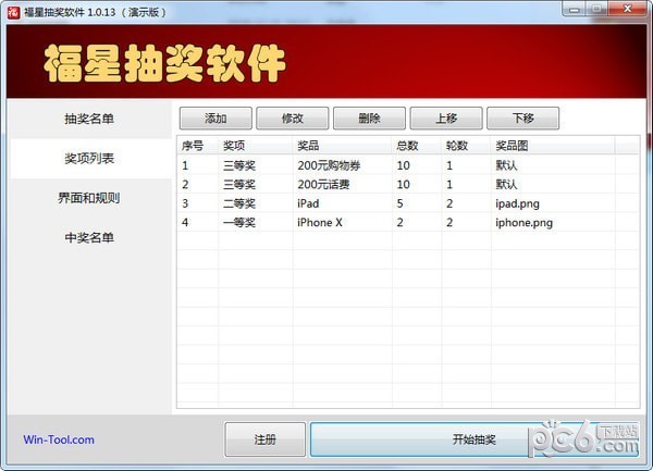 在獎項列表中維護所有獎項信息。抽獎順序為從上到下,即序號為1的獎項最先抽取,可以通過上移或下移按鈕來調整獎項的順序。