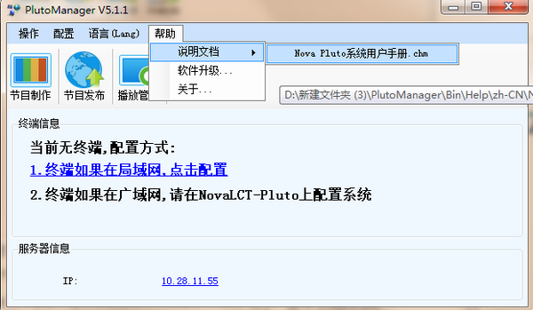 PlutoManager根據(jù)局域網(wǎng)絡(luò)或外網(wǎng)地址聯(lián)接異步控制卡,基本功能有終端管理,編寫播放方案,推送播放方案,實(shí)時(shí)監(jiān)控播放等信息。