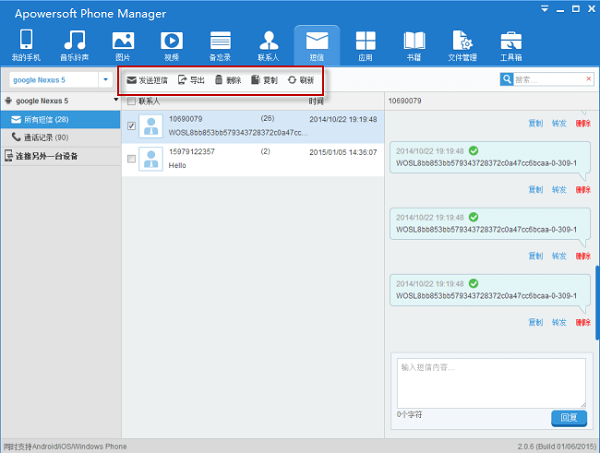 短信:短信界面可以將您的短信備份進電腦,也允許用戶在該界面將短信進行復制、轉發(fā)及刪除。同時它能一鍵選中并刪除所有的短信內容,點擊刷新按鍵后所有更改的內容便即時同步到手機里了。更為方便的是將聯(lián)系人添加到通訊錄,填寫好收信人的號碼及內容就可以開始與其快速收發(fā)短信了。
