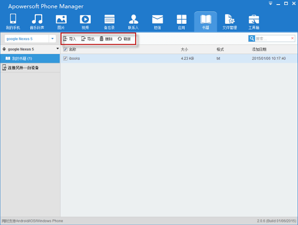 電子書:如果您是位讀書愛好者,您可能會非常青睞書籍功能這塊。您可以導入各種電子書籍到您的手機中以便閑暇時刻閱讀。這里會顯示書籍的名稱、大小、格式和添加日期。手機里面的書籍也能被導出到電腦中。