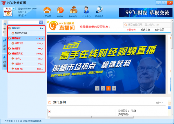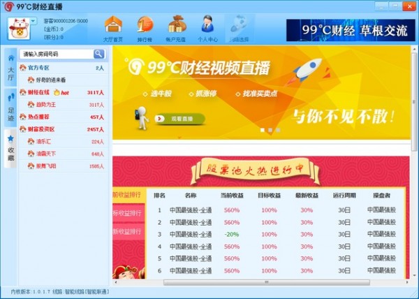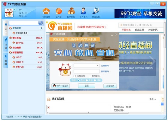 KKX小編為大家?guī)淼?9℃財(cái)經(jīng)直播平臺(tái)是一款專業(yè)的股票理財(cái)投資平臺(tái),是深圳華臣天拓網(wǎng)絡(luò)科技有限公司研發(fā)的一款財(cái)經(jīng)類視頻直播互動(dòng)平臺(tái)PC端軟件,99℃財(cái)經(jīng)直播平臺(tái)操作流暢,系統(tǒng)穩(wěn)定,實(shí)盤解析,高手在線視頻交流,高端數(shù)據(jù)指標(biāo)軟件,完全免費(fèi)的一款理財(cái)投資軟件,一教到底。
