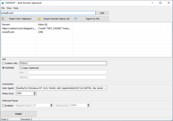Bulk Domain Appraisal對大的域列表執(zhí)行多個域評估。填寫你的批量域名列表和評估你的所有域名。使用此工具,您可以輕松計算域名值。允許使用剪貼板或txt文件導入域名列表。結果可以導出為TXT或csv文件。默認情況下,評估軟件使用的是gody工具。請注意,GoDaddy API每分鐘只允許60個請求。