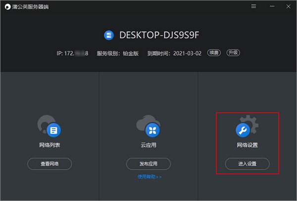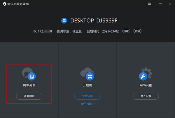 蒲公英服務(wù)器端主要用于在服務(wù)器端安裝使用,可以為企業(yè)提供智能組網(wǎng)整體解決方案的工具,登錄成功后可查看到服務(wù)端的主要三大功能:1.網(wǎng)絡(luò)列表,2.云應(yīng)用,3.網(wǎng)絡(luò)設(shè)置。和已有訪問(wèn)者客戶端相同均具可作為軟件成員加入到組網(wǎng)內(nèi)實(shí)現(xiàn)互聯(lián)互通,但整體界面為全新樣式,新增云應(yīng)用發(fā)布功能,快速創(chuàng)建組網(wǎng),支持發(fā)布云應(yīng)用,訪問(wèn)云應(yīng)用請(qǐng)安裝蒲公英訪問(wèn)端。