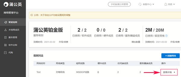 點(diǎn)擊【查看網(wǎng)絡(luò)】,跳到蒲公英組網(wǎng)管理界面,點(diǎn)擊【查看詳情】即可查看組網(wǎng)成員;