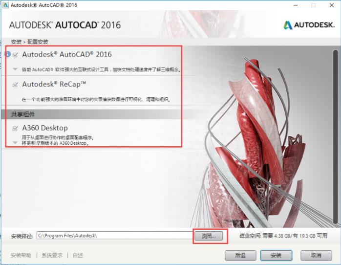 5、進(jìn)入AutoCAD2016配置安裝界面中,您需要根據(jù)自己的需求確定您是否安裝“AutoCAD2016”,“ReCap”和“A360 Desktop”選擇完成后,點擊【瀏覽】選擇AutoCAD2016安裝位置,然后點擊【安裝】。