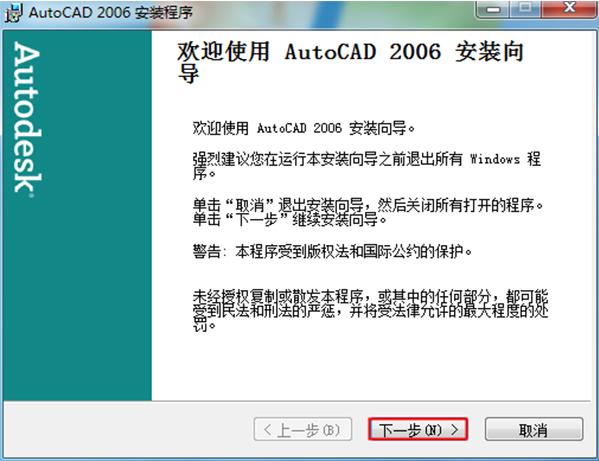 2.歡迎使用AutoCAD 2006安裝向?qū)?,下一步點(diǎn)擊