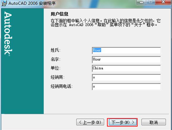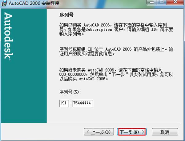 3.輸入序列號(hào)“191-75444444”,CAD2006序列號(hào)比較多,能用就行點(diǎn)擊“下一步”;