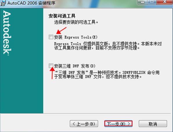 5.Express Tools和DWF發(fā)布根據(jù)自己需要是否安裝,,點(diǎn)擊“下一步”;
