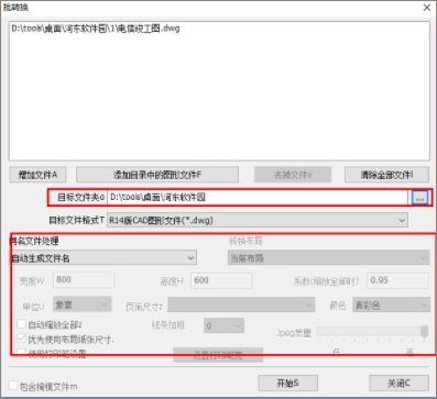 6、緊接著,我們選擇相依的目標(biāo)文件夾、同名文件處理、轉(zhuǎn)換布局、打印筆寬等參數(shù)進(jìn)行設(shè)置;