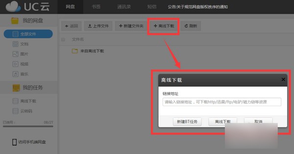 離線下載是服務(wù)器取代客戶到目的網(wǎng)站下載文件,并存放到UC網(wǎng)盤的一種下載工具。