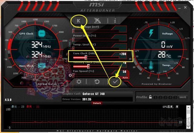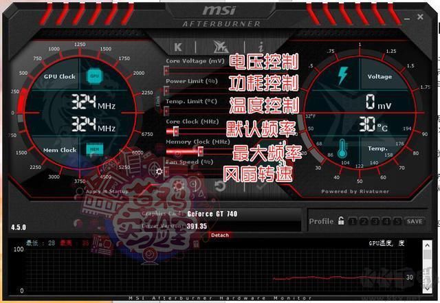2、如下圖所示就是界面幾個(gè)拉條的意思,因?yàn)槲疫@張GT740是屬于低功耗不帶供電的,所以電壓和功耗限制都動(dòng)不了的,如果你從第一步開始解鎖了電壓調(diào)整的話,直接把功耗限制拉滿即可。