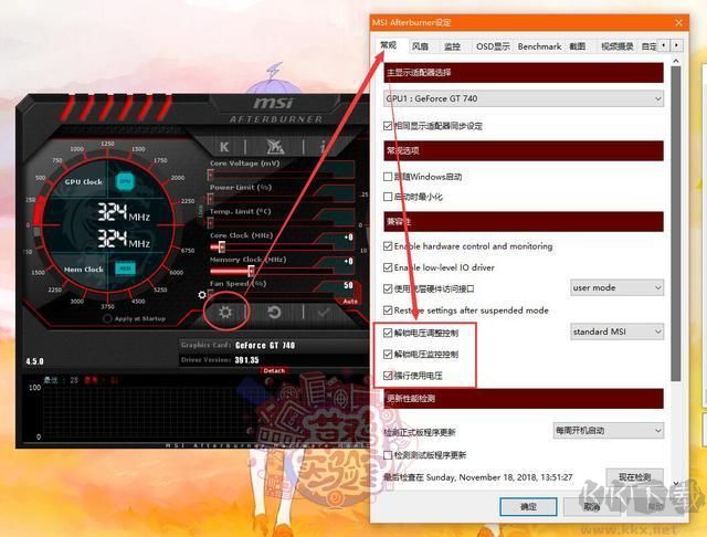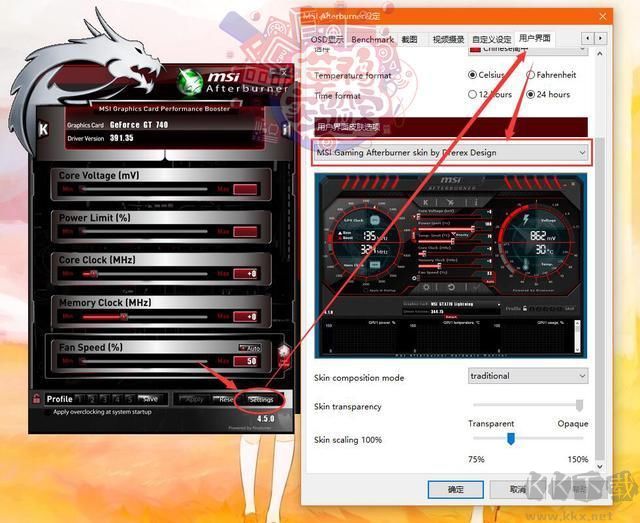 1、打開Afterburner,點(diǎn)擊設(shè)置按鈕,如下圖所示,把電壓調(diào)整啥的都勾上。如果你發(fā)現(xiàn)界面和我的不一樣,你可以如下另一張圖所示更換界面皮膚。