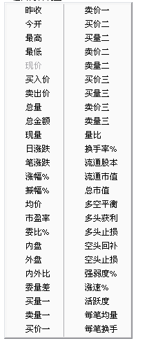 要想更換某一欄的內(nèi)容,請用鼠標右鍵點擊其欄目名稱,然后從彈出菜單上選擇新欄目。例,右鍵點擊『現(xiàn)價』欄,彈出菜單后,找到『市盈率』,左鍵點擊它,則該欄目內(nèi)容換成市盈率。