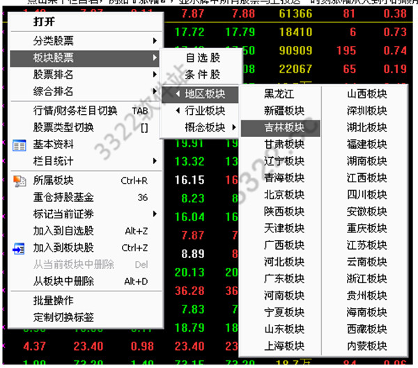 別切換到不同股票群的報價牌。例如,右鍵點擊板塊股,會有下面的彈出菜單,供用戶切換到其他板塊的
