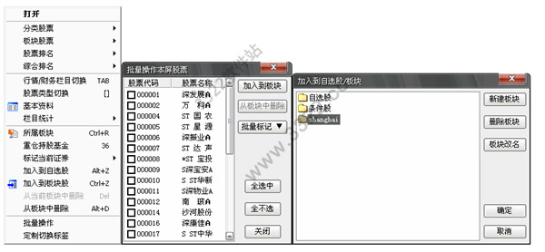 按前面介紹的方法找到需要的股票后,用鼠標右鍵點擊它,從彈出菜單上選擇〖加入到自選股〗或〖加入到板塊〗,或按Ctrl+Z。刪除自選股按ALT+D