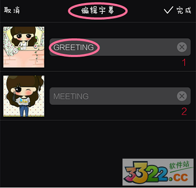 2)點擊進(jìn)入字幕編輯界面,將灰色區(qū)域的字幕刪掉后,編輯你自己的字幕,一般來說要求字符或者英文,不能寫中文。而且字符長度有限制,建議大家使用簡單的單詞