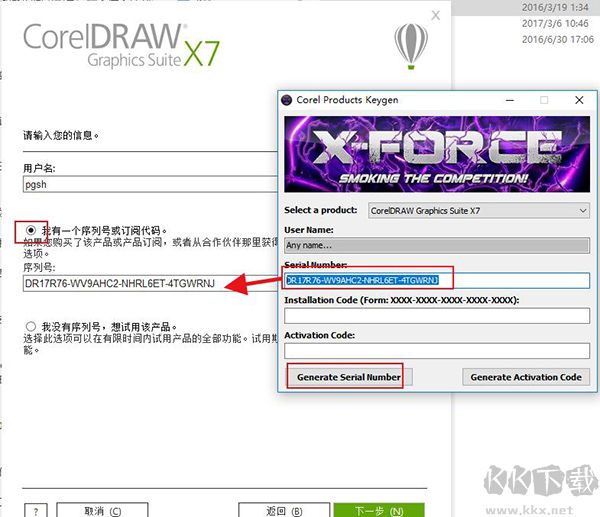 2、這時(shí)再打開(kāi)CorelDRAW X7注冊(cè)機(jī),將選擇對(duì)應(yīng)的版本生成注冊(cè)碼然后將注冊(cè)碼復(fù)制到軟件上