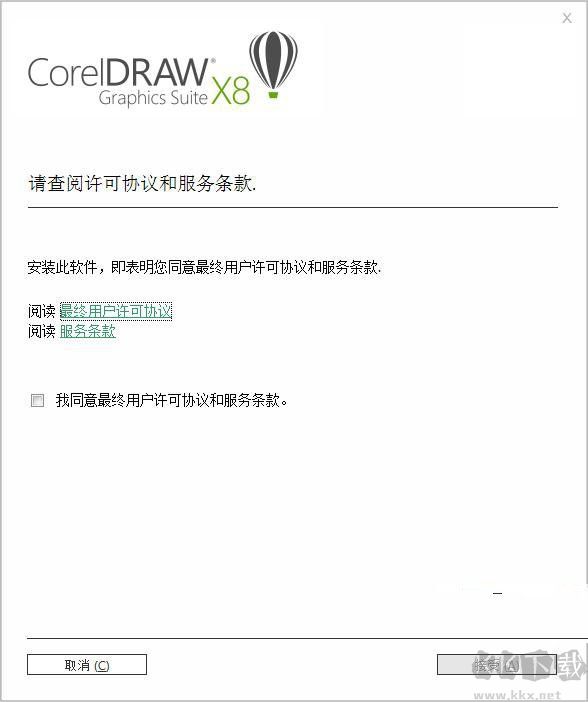 1、首先點(diǎn)擊cdr x8應(yīng)用程序進(jìn)入安裝,點(diǎn)擊“我接受”,繼續(xù)下一步;