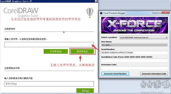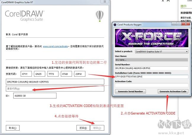(2)已經(jīng)寫(xiě)到CorelDraw X8注冊(cè)機(jī)上后,點(diǎn)擊注冊(cè)機(jī)的"Generate Activation Code"按鈕,在Activation Code下方會(huì)出現(xiàn)代碼,復(fù)制到CorelDraw X8軟件的激活代碼中,然后點(diǎn)擊軟件的繼續(xù)按鈕。