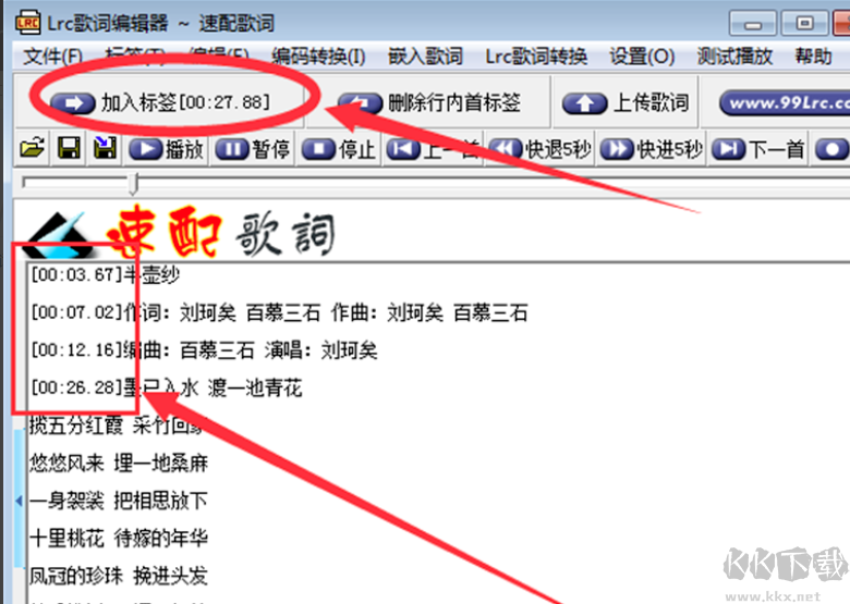 3、返回Lrc歌詞編輯器中將鼠標(biāo)光標(biāo)停到歌詞前,等播放到想出現(xiàn)歌詞的地方快速點(diǎn)擊【加入標(biāo)簽】選項(xiàng)。