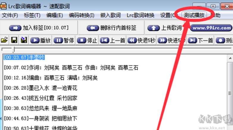 5、修改完成后,您可以點(diǎn)擊軟件頂部菜單的【測(cè)試播放】查看歌詞是否正確,如有有誤,您繼續(xù)修改。