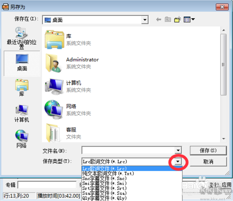 6、如果正確,您可以點(diǎn)擊Lrc歌詞編輯器菜單中的【文件】在打開的選項(xiàng)中點(diǎn)擊【另存為】,輸入文件名,選擇文件保存類型.Lrc格式,選擇完成后點(diǎn)擊【保存】就可以了。