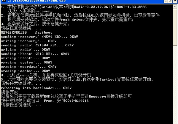 3、cmd會(huì)運(yùn)行一些東西,最后輸入platform-tools[空格]flash[空格]recovery[空格]1.img 成功后會(huì)有提示。