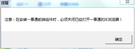 2、彈出提示框,提示用戶在安裝一事通前端組件時(shí),必須關(guān)閉已經(jīng)打開一事通的IE瀏覽器,可直接跳過(guò)并點(diǎn)擊“確定”,如kkx分享的圖片