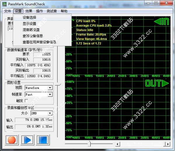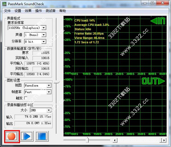 2、打開文件,設(shè)置相應(yīng)的聲音格式,點擊圓圈圖標(biāo)即可開始最基本的聲卡測試