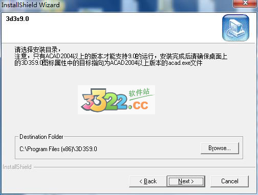 三、選擇3d3s9.0的安裝路徑,默認(rèn)路徑為C:\Program Files (x86)\3D3S9.0,可默認(rèn)或點(diǎn)擊Broese更換安裝路徑,完成路徑選擇并點(diǎn)擊Next,如下圖所示: