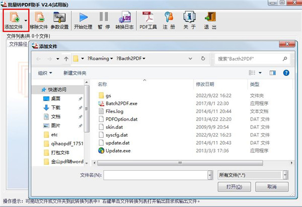 3、點(diǎn)擊【添加文件】按鈕,然后導(dǎo)入要轉(zhuǎn)換的文件(支持任何可打印文件)。