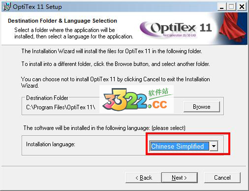 六、選擇軟件的安裝路徑,默認(rèn)路徑為C:\Program Files\OptiTex 11\,若需要更改路徑可點(diǎn)擊Browse更換,同時(shí)選擇“Chinese Simplified”并點(diǎn)擊“Next”,如kkx分享的Optitex安裝截圖: