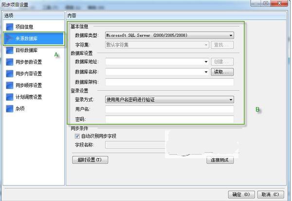 四、最先轉(zhuǎn)換到"由來數(shù)據(jù)庫"菜單欄。填好同步由來數(shù)據(jù)庫信息內(nèi)容(儲放必須同歩數(shù)據(jù)的數(shù)據(jù)庫稱為由來數(shù)據(jù)庫);