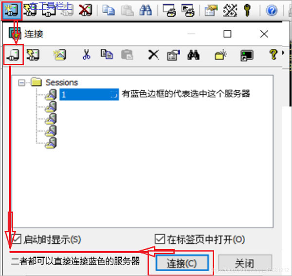 1、選擇下圖【工具欄】的圖標【連接】就會到一個叫做連接的窗口里面有,直接連接的圖標【連接】點擊這個圖標或者下方是【連接】會直接連接藍色已經(jīng)選中的服務器;