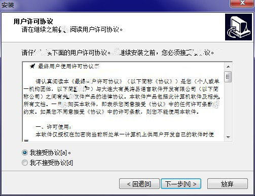 3、來到用戶許可協(xié)議界面后,選擇“我接受協(xié)議”這一項,然后點擊“下一步”