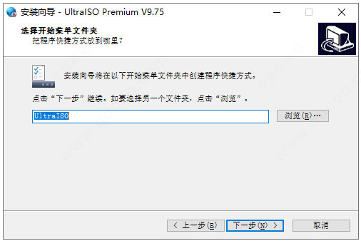 3、選擇開始菜單文件夾,點擊瀏覽可以自由選擇文件夾:默認文件夾【UltraISO】,如下圖kkx小編分享的安裝截圖: