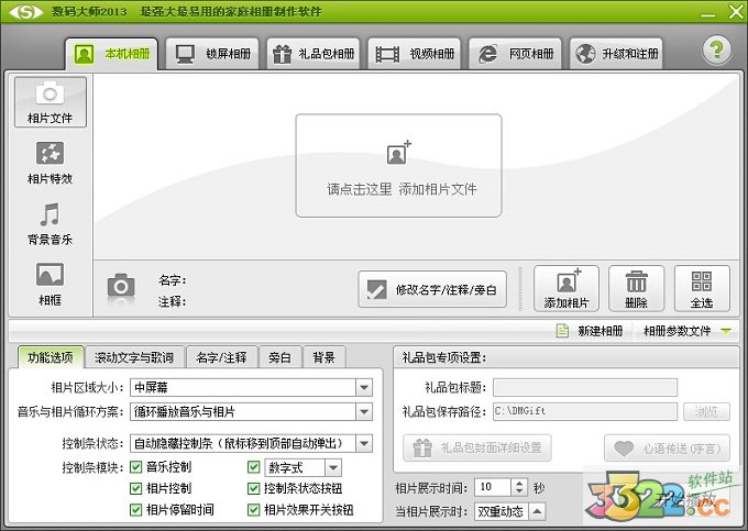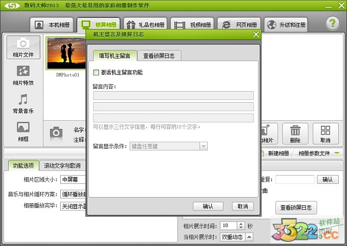 1. 家庭本機(jī)數(shù)碼相冊(cè)制作:“本機(jī)電子相冊(cè)”可以輕松將您喜歡的圖片,數(shù)碼相機(jī)拍出的照片等進(jìn)行數(shù)碼特技處理,配上動(dòng)聽(tīng)的背景音樂(lè)、專業(yè)的切換特效、生動(dòng)逼真的動(dòng)態(tài)藝術(shù)場(chǎng)景、動(dòng)感的鏡頭縮放特效、獨(dú)特的文字與旁白特效、豐富的注釋功能、個(gè)性多彩的藝術(shù)相框和獨(dú)創(chuàng)的MTV歌詞特效等,制造出一流專業(yè)效果的家庭數(shù)碼相冊(cè)。數(shù)碼大師界面數(shù)碼大師界面2. 禮品包相冊(cè)制作:可以在您制作好的本機(jī)電子相冊(cè)基礎(chǔ)上,通過(guò)簡(jiǎn)單的打包設(shè)置,即可自動(dòng)生成可分發(fā)的禮品包相冊(cè),可以作為自己收藏分類相片之用,您更可以作為禮物方便地分發(fā)出去,對(duì)方無(wú)需安裝,即可讓親朋好友共享觀賞您的得意之作!3. 視頻影像文件導(dǎo)出功能(視頻相冊(cè)制作):視頻導(dǎo)出功能可以將您看到的相框內(nèi)所有情景直接導(dǎo)出為VCD/SVCD/DVD甚至是I視頻電子相冊(cè),讓您輕松制作專業(yè)絢麗的視頻數(shù)碼相冊(cè)成為可能。這樣,您便可將制作的相冊(cè)在VCD/DVD或高清BD等影碟機(jī)自由觀賞,而無(wú)需借助電腦,您也可以導(dǎo)出DVD或AVI等高清格式并將視頻相冊(cè)上傳到網(wǎng)上。所有這一切都能讓您的親朋好友不分年齡即可方便地欣賞您創(chuàng)作的動(dòng)感禮物!4. 網(wǎng)頁(yè)數(shù)碼相冊(cè)制作:通過(guò)打包導(dǎo)出為簡(jiǎn)潔的網(wǎng)頁(yè)相冊(cè),您便可將漂亮獨(dú)特的數(shù)碼影集放到互聯(lián)網(wǎng)或直接分發(fā)網(wǎng)頁(yè)的形式,讓世界各地的人通過(guò)上網(wǎng)或直接打開(kāi)瀏覽器立即欣賞您的精彩制作!5. 多媒體鎖屏相冊(cè)制作:只要在制作好的本機(jī)電子相冊(cè)基礎(chǔ)上簡(jiǎn)單選擇,軟件即可自動(dòng)轉(zhuǎn)變成一個(gè)靚麗的多媒體鎖屏系統(tǒng),在您離開(kāi)電腦時(shí),不但可以展現(xiàn)您精心創(chuàng)作的精美個(gè)性相冊(cè),還可以實(shí)時(shí)鎖定視窗并安全保護(hù)您的系統(tǒng),實(shí)現(xiàn)視頻展示、文字留言、密碼保護(hù)等各種先進(jìn)功能,同時(shí)又兼具有屏幕保護(hù)用途,應(yīng)用非常廣泛,是獨(dú)創(chuàng)的全新概念型跨界數(shù)碼相冊(cè)。更動(dòng)感精致、更順滑流暢、更簡(jiǎn)單易用,這就是全新的數(shù)碼大師。一切絢麗優(yōu)雅的專業(yè)效果都在您輕松的數(shù)碼制作中完美實(shí)現(xiàn)