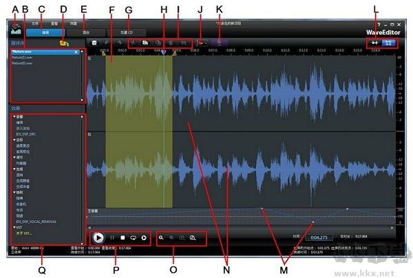A - WaveEditor 菜單,B - 音頻庫(kù),C - 編輯音頻,D - 導(dǎo)入音頻,E - 混音,F(xiàn) - 選擇范圍,G - 創(chuàng)建 CD,H - 時(shí)間線(xiàn)滑塊,I - 編輯工具,J - 書(shū)簽,K - 錄制音頻,L - 聲道選擇,M - 主音量控制,N - 時(shí)間線(xiàn)上的音軌,O - 時(shí)間線(xiàn)縮放控制器,P - 播放控制器,Q - 效果